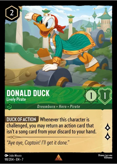 DUCK OF ACTION Whenever this character is challenged, you may return an action card that isn't a song card from your discard to your hand.