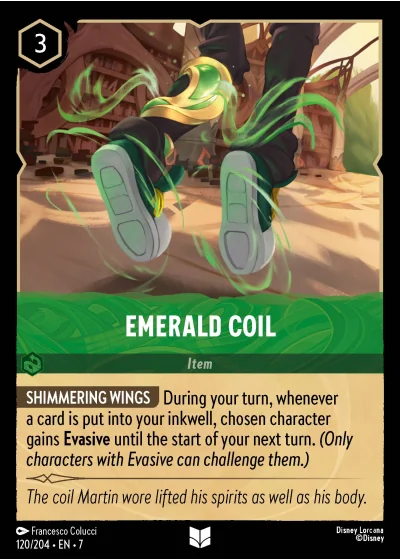 SHIMMERING WINGS During your turn, whenever a card is put into your inkwell, chosen character gains Evasive until the start of your next turn. (Only characters with Evasive can challenge them.)
