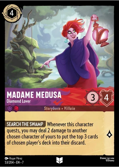 SEARCH THE SWAMP Whenever this character quests, you may deal 2 damage to another chosen character of yours to put the top 3 cards of chosen player's deck into their discard.