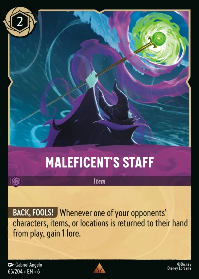 BACK, FOOLS! Whenever one of your opponents' characters, items, or locations is returned to their hand from play, gain 1 lore.