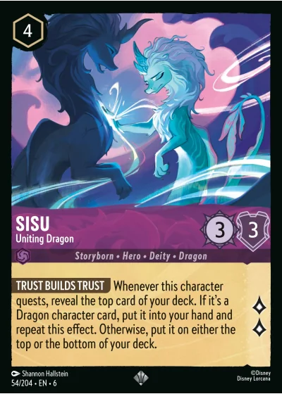 TRUST BUILDS TRUST Whenever this character quests, reveal the top card of your deck. If it's a Dragon character card, put it into your hand and repeat this effect. Otherwise, put it on either the top or the bottom of your deck.