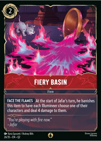 FACE THE FLAMES At the start of Jafar's turn, he banishes this item to have each Illumineer choose one of their characters and deal 4 damage to them.
