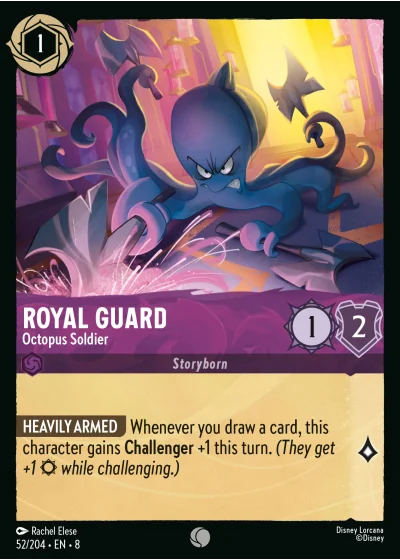 HEAVILY ARMED Whenever you draw a card, this character gains Challenger +1 this turn. (They get +1 ¤ while challenging.)