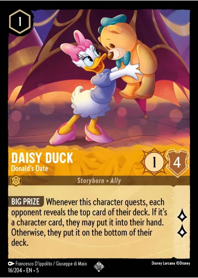 BIG PRIZE Whenever this character quests, each opponent reveals the top card of their deck. If it's a character card, they may put it into their hand. Otherwise, they put it on the bottom of their deck.