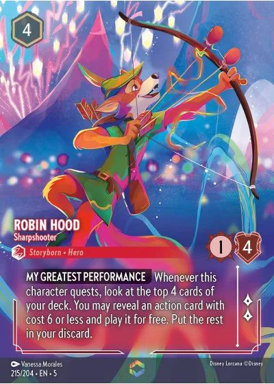 MY GREATEST PERFORMANCE Whenever this character quests, look at the top 4 cards of your deck. You may reveal an action card with cost 6 or less and play it for free. Put the rest in your discard.