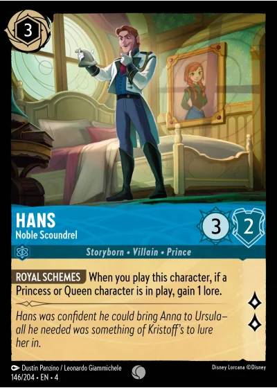 ROYAL SCHEMES When you play this character, if a Princess or Queen character is in play, gain 1 lore.