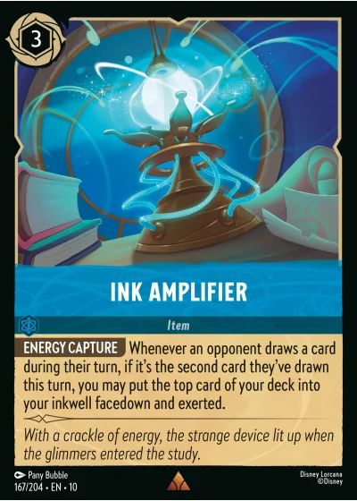 ENERGY CAPTURE Whenever an opponent draws a card during their turn, if it's the second card they've drawn this turn, you may put the top card of your deck into your inkwell facedown and exerted.
