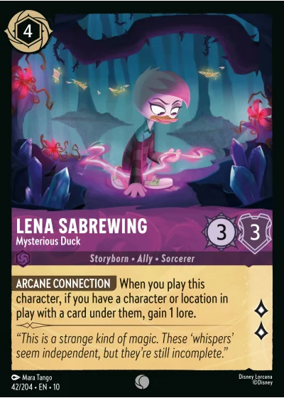 ARCANE CONNECTION When you play this character, if you have a character or location in play with a card under them, gain 1 lore.