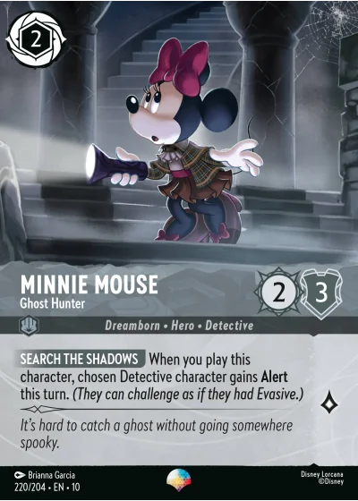 SEARCH THE SHADOWS When you play this character, chosen Detective character gains Alert this turn. (They can challenge as if they had Evasive.)