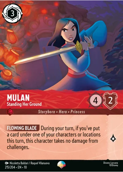 FLOWING BLADE During your turn, if you've put a card under one of your characters or locations this turn, this character takes no damage from challenges.