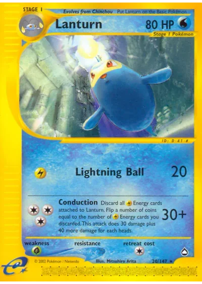 Discard all Energy cards attached to Lanturn. Flip a number of coins equal to the number of Energy cards you discarded. This attack does 30 damage plus 40 more damage for each heads.