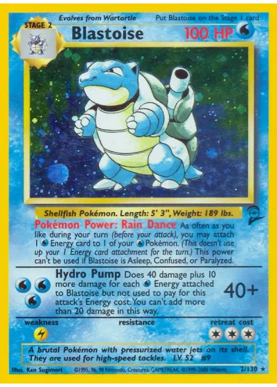 Does 40 damage plus 10 more damage for each Water Energy attached to Blastoise but not used to pay for this attack's Energy cost. You can't add more than 20 damage in this way.