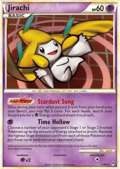 Choose a number of your opponent's Stage 1 or Stage 2 Evolved Pokémon up to the amount of Energy attached to Jirachi. Remove the highest Stage Evolution card from each of those Pokémon and put those cards back into your opponent's hand.