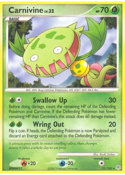 Before doing damage, count the remaining HP of the Defending Pokémon and Carnivine. If the Defending Pokémon has fewer remaining HP than Carnivine's, this attack does 60 damage instead.