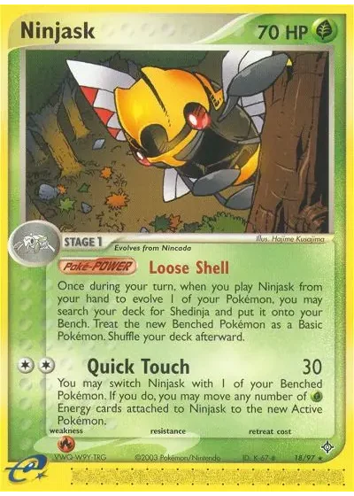 You may switch Ninjask with 1 of your Benched Pokémon. If you do, you may move any number of Grass Energy cards attached to Ninjask to the new Active Pokémon.