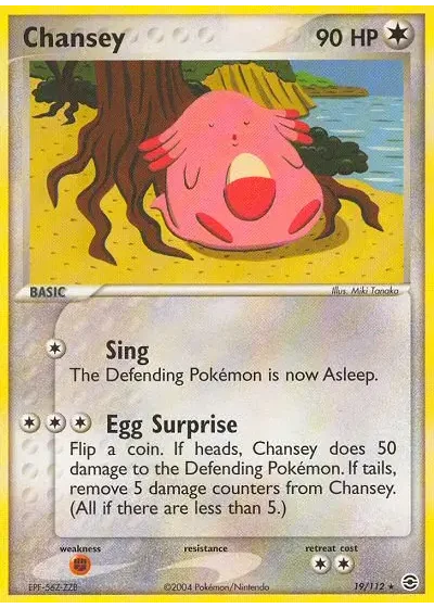 Flip a coin. If heads, Chansey does 50 damage to the Defending Pokémon. If tails, remove 5 damage counters from Chansey. (All if there are less than 5.)