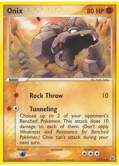 Choose up to 2 of your opponent's Benched Pokémon. This attack does 10 damage to each of them. (Don't apply Weakness and Resistance for Benched Pokémon.) Onix can't attack during your next turn.