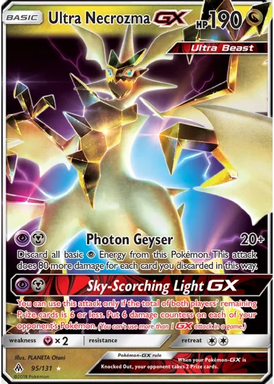 You can use this attack only if the total of both players’ remaining Prize cards is 6 or less. Put 6 damage counters on each of your opponent’s Pokémon. (You can’t use more than 1 GX attack in a game.)