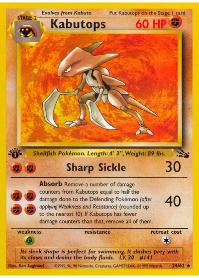 Remove a number of damage counters from Kabutops equal to half the damage done to Defending Pokémon (after applying Weakness and Resistance) (rounded up to the nearest 10). If Kabutops has fewer damage counters than that, remove all of them.