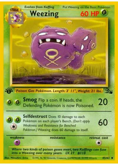 Does 10 damage to each Pokémon on each player's Bench. (Don't apply Weakness and Resistance for Benched Pokémon.) Weezing does 60 damage to itself.
