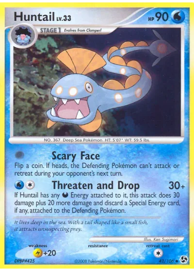 If Huntail has any Darkness Energy attached to it, this attack does 30 damage plus 20 more damage and discard a Special Energy card, if any, attached to the Defending Pokémon.