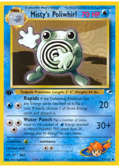 Flip a number of coins equal to the number of Energy attached to Misty's Poliwhirl. This attack does 30 damage plus 10 damage for each heads.