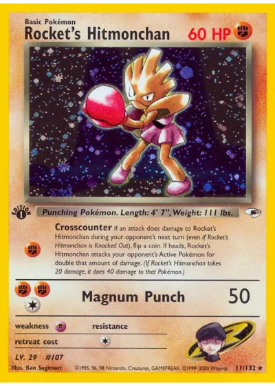 If an attack does damage to Rocket's Hitmonchan during your opponent's next turn (even if Rocket's Hitmonchan is Knocked Out), flip a coin. If heads, Rocket's Hitmonchan attacks your opponent's Active Pokémon for double that amount of damage. (If Rocket's Hitmonchan takes 20 damage, it does 40 damage to that Pokémon.)
