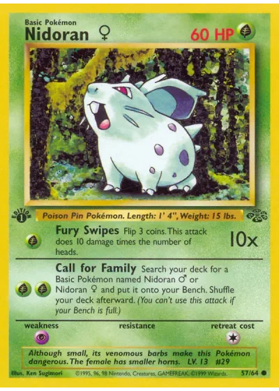 Search your deck for a Basic Pokémon named Nidoran M or Nidoran F and put it onto your Bench. Shuffle your deck afterward. (You can't use this attack if your Bench is full.)
