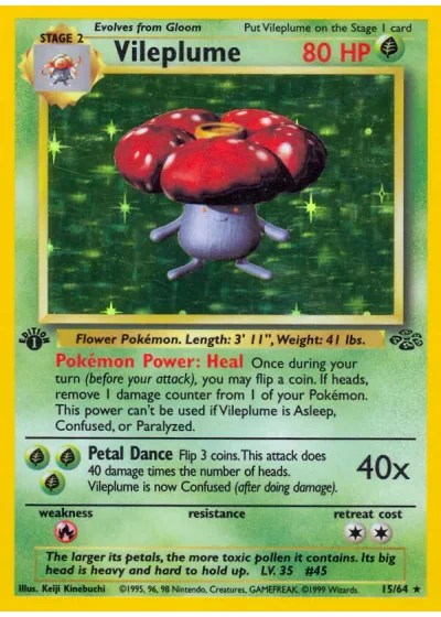 Flip 3 coins. This attack does 40 damage times the number of heads. Vileplume is now Confused (after doing damage).