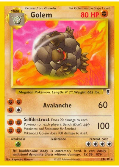 Does 20 damage to each Pokémon on each player's Bench. (Don't apply Weakness and Resistance for Benched Pokémon.) Golem does 100 damage to itself.