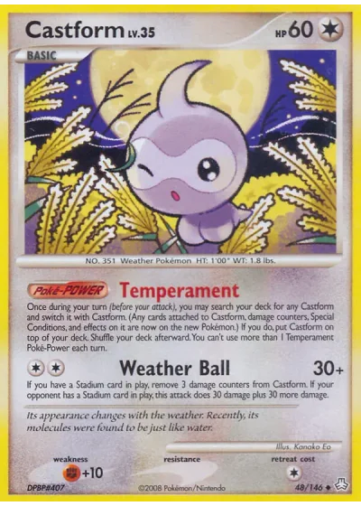 If you have a Stadium card in play, remove 3 damage counters from Castform. If your opponent has a Stadium card in play, this attack does 30 damage plus 30 more damage.