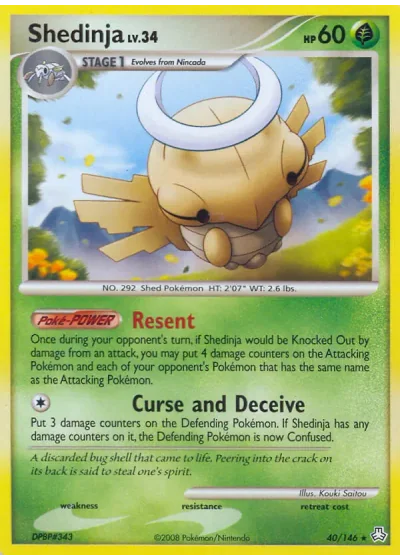Put 3 damage counters on the Defending Pokémon. If Shedinja has any damage counters on it, the Defending Pokémon is now Confused.