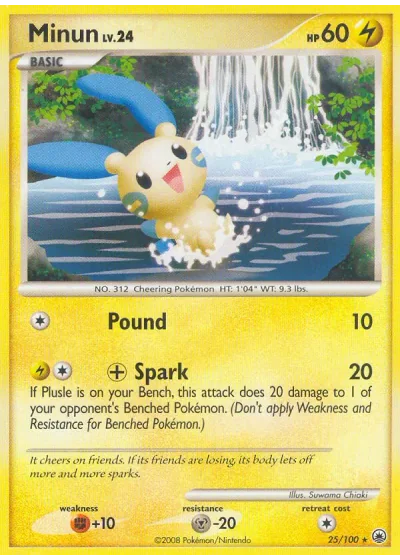 If Plusle is on your Bench, this attack does 20 damage to 1 of your opponent's Benched Pokémon. (Don't apply Weakness and Resistance for Benched Pokémon.)