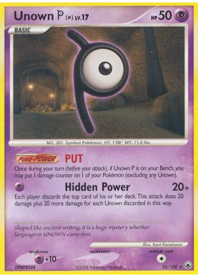 Each player discards the top card of his or her deck. This attack does 20 damage plus 20 more damage for each Unown discarded in this way.