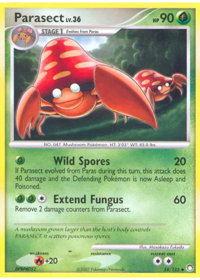 If Parasect evolved from Paras during this turn, this attack does 40 damage and the Defending Pokémon is now Asleep and Poisoned.