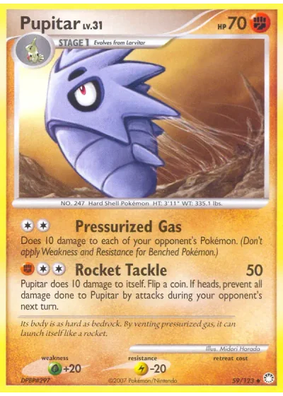 Pupitar does 10 damage to itself. Flip a coin. If heads, prevent all damage done to Pupitar by attacks during your opponent's next turn.