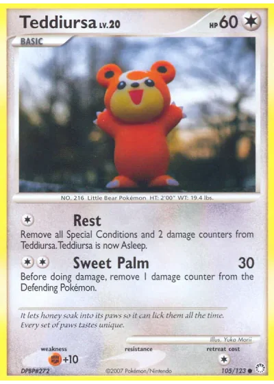 Remove all Special Conditions and 2 damage counters from Teddiursa. Teddiursa is now Asleep.