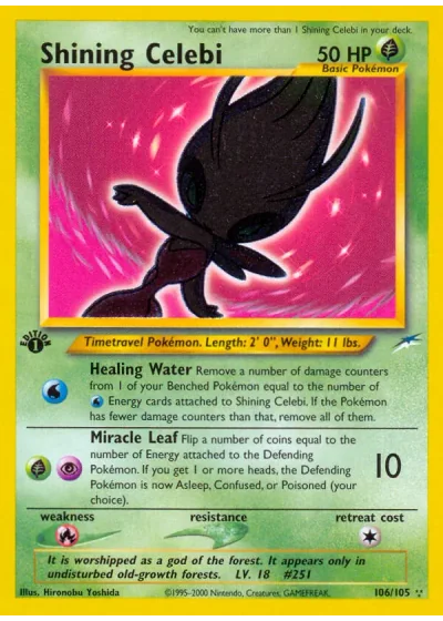 Remove a number of damage counters from 1 of your Benched Pokémon equal to the number of Energy cards attached to Shining Celebi. If the Pokémon has fewer damage counters than that, remove all of them.
