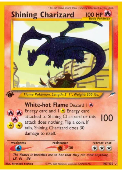 Discard 1 Energy card and 1 Energy card attached to Shining Charizard or this attack does nothing. Flip a coin. If tails, Shining Charizard does 30 damage to itself.