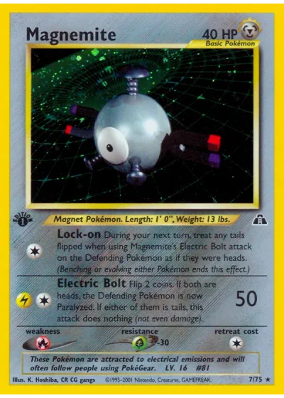 During your next turn, treat any tails flipped when using Magnemite's Electric Bolt attack on the Defending Pokémon as if they were heads. (Benching or evolving either Pokémon ends this effect.)