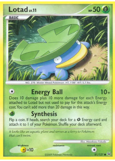 Does 10 damage plus 10 more damage for each Energy attached to Lotad but not used to pay for this attack's Energy cost. You can't add more than 20 damage in this way.