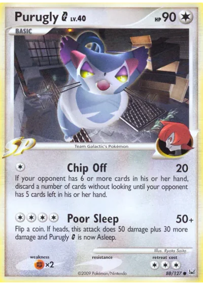 Flip a coin. If heads, this attack does 50 damage plus 30 more damage and Purugly is now Asleep.