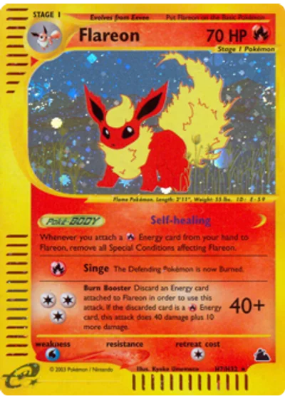 Discard an Energy card attached to Flareon in order to use this attack. If the discarded card is a Energy card, this attack does 40 damage plus 10 more damage.