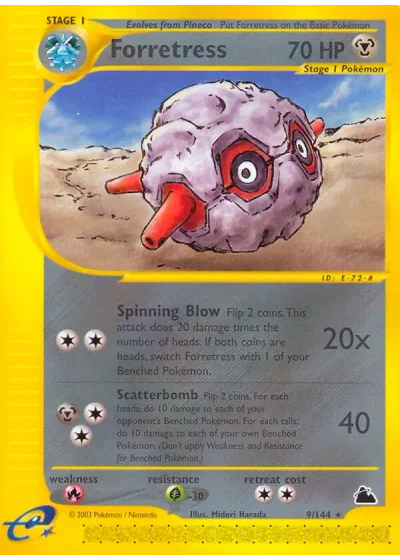 Flip 2 coins. This attack does 20 damage times the number of heads. If both coins are heads, switch Forretress with 1 of your Benched Pokémon.