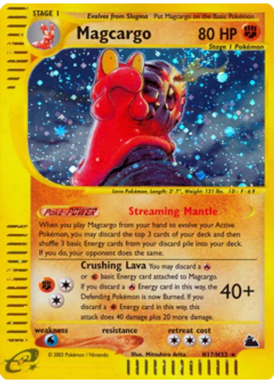 You may discard a or basic Energy card attached to Magcargo. If you discard a Energy card in this way, the Defending Pokémon is now Burned. If you discard a Energy card in this way, this attack does 40 damage plus 20 more damage.