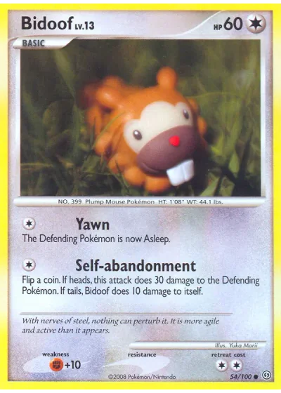 Flip a coin. If heads, this attack does 30 damage to the Defending Pokémon. If tails, Bidoof does 10 damage to itself.