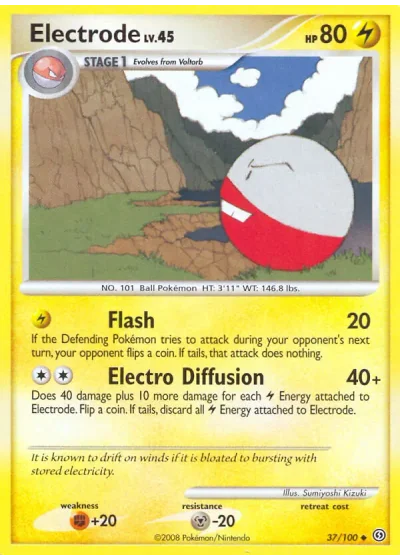 Does 40 damage plus 10 more damage for each Lightning Energy attached to Electrode. Flip a coin. If tails, discard all Lightning Energy attached to Electrode.