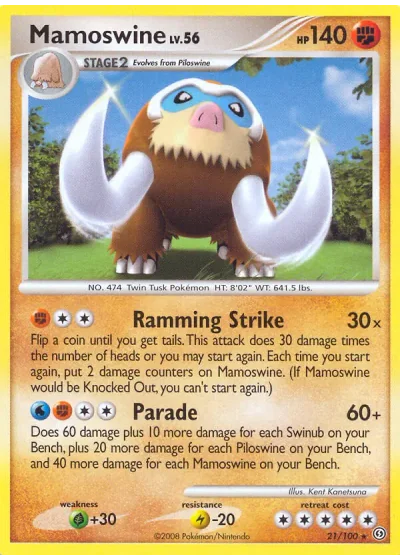 Flip a coin until you get tails. This attack does 30 damage times the number of heads or you may start again. Each time you start again, put 2 damage counters on Mamoswine. (If Mamoswine would be Knocked Out, you can't start again.)