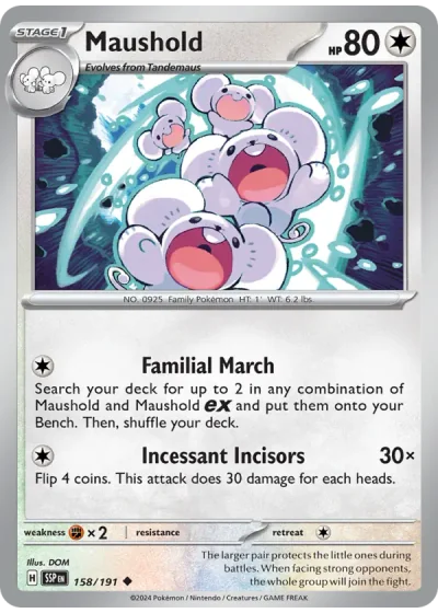 Search your deck for up to 2 in any combination of Maushold and Maushold ex and put them onto your Bench. Then, shuffle your deck.
