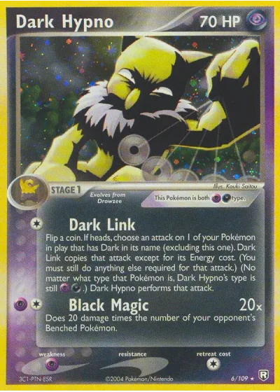 Flip a coin. If heads, choose an attack on 1 of your Pokémon in play that has Dark in its name (excluding this one). Dark Link copies that attack except for its Energy cost. (You must still do anything else required for that attack.) (No matter what type that Pokémon is, Dark Hypno's type is still PsychicDarkness.) Dark Hypno performs that attack."